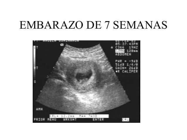 A las 7 semanas de embarazo, las náuseas son lo más destacado de esta etapa, así como la incontrolable somnolencia que puede asolar a las futuras mamás Parece que el sueño es interminable, y la irritabilidad parece salir de la nada!Generalmente se le hará un ultrasonido entre las semanas 10 y 14 del embarazo Con frecuencia este se llama ultrasonido para determinar la edad gestacional porque se hace para saber cuántas semanas tiene de embarazo y estimar su posible fecha de parto A las 7 semanas de embarazo, el bebé es del tamaño de un arándano Tu embrión mide alrededor de 051 pulgadas, ya mide el doble de tamaño desde la semana pasada Él o ella no es que exactamente se acerque a las escalas todavía, pero se está desarrollando como loco dentro de tu vientre de 7 semanas de embarazo